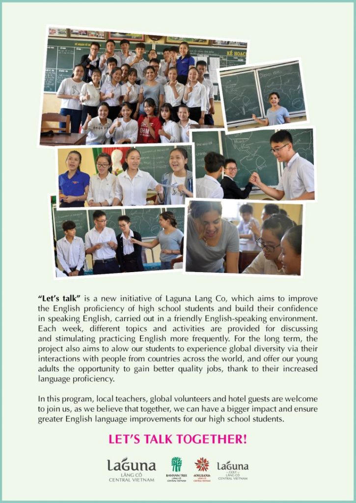 “Let’s talk” is a new initiative of Laguna Lăng Cô, which aims to improve the English proficiency of high school students and build their confidence in speaking English, carried out in a friendly English-speaking environment. Each week, different topics and activities are provided for discussing and stimulating practicing English more frequently. For the long term, the project also aims to alow our students to experience global diversity via their interactions with people from countries across the world, and offer our young adults the opportunity to gain better quality jobs, thank to their increased language proficiency.
